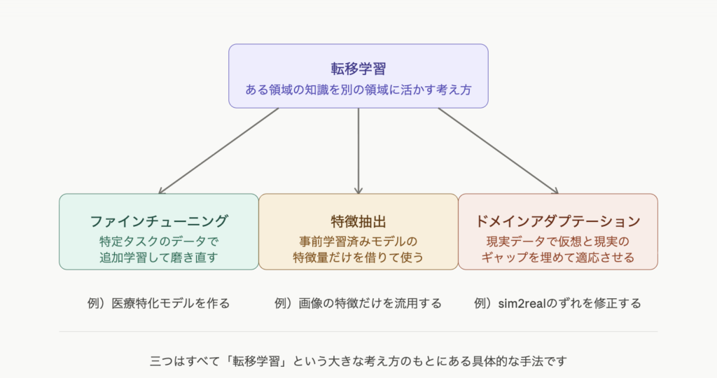 ここで一つ、前のページで登場した「転移学習」との関係を整理しておきましょう。転移学習とファインチューニングは混同されやすいですが、こう考えると区別しやすくなります。